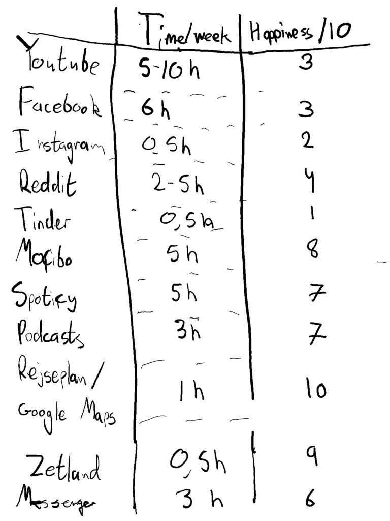 Now comes the important part: Look at the two columns and compare them: Are you using 5 hours each week on something that creates 2/10 feelings? Or 20 hours on something that creates 4/10? Then you should probably reconsider your use of time.