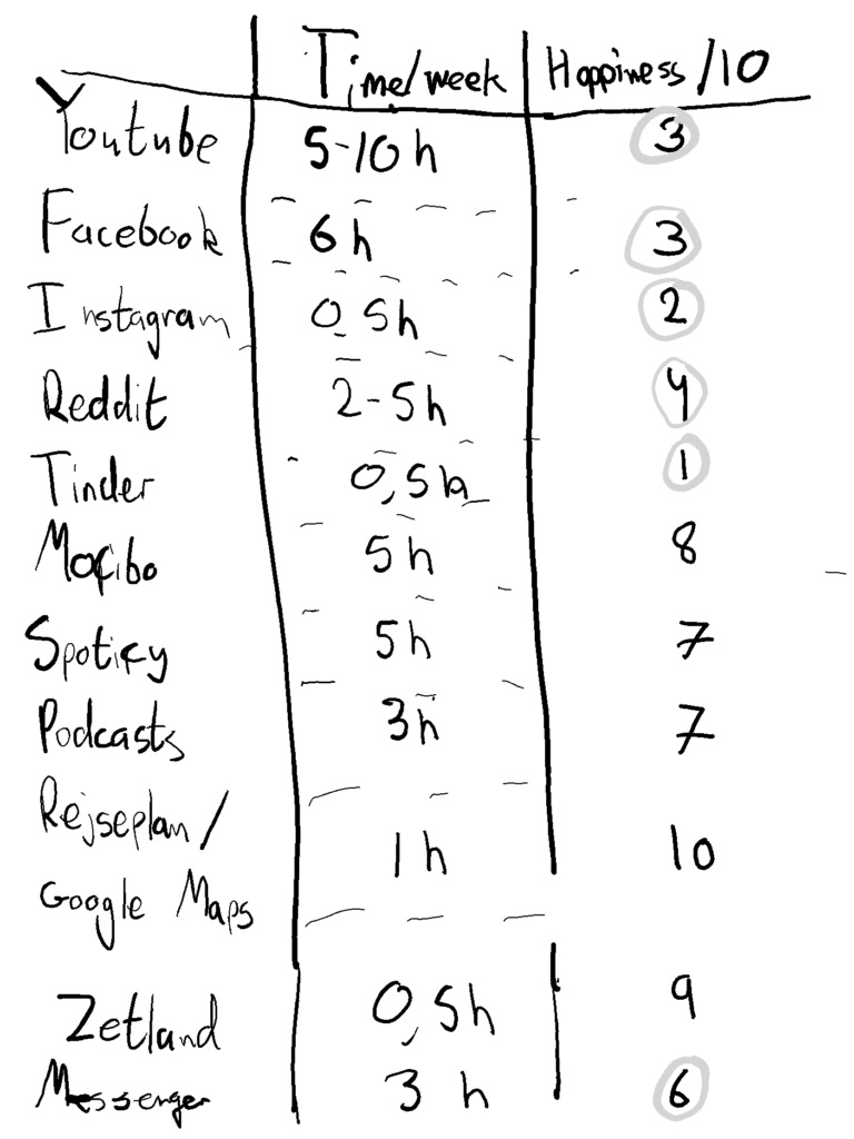 Now, go through the list again, and add another column: How do you feel about the specific service you are using your time on? Does it make you happy when you are using it? Does it solve some important need for you?