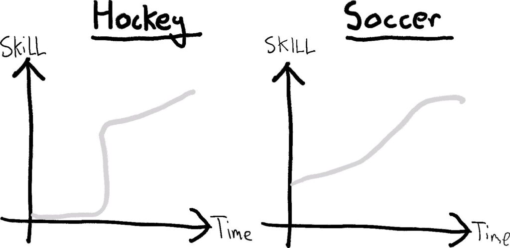 This is not because hockey is a harder sport in absolute terms – the learning curve is just different. If you want to be able to beat the average person, you should choose a skill where the average person is atrocious.